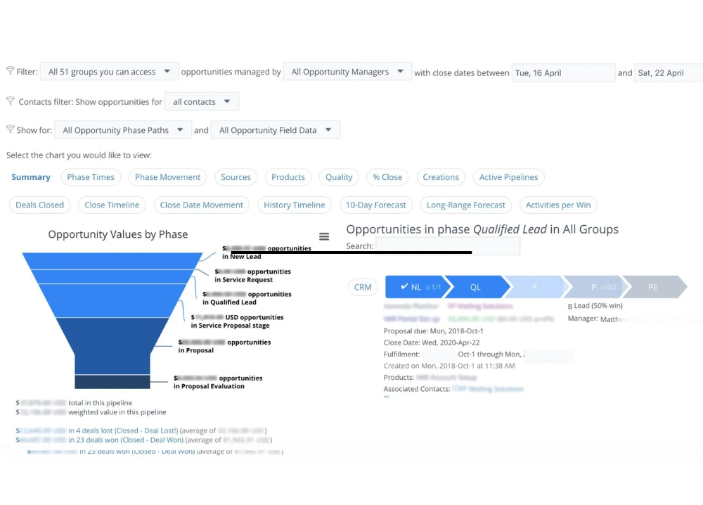 Stay on top of your leads and give yourself the best chance of winning deals with Opportunities. PerformNOW wants your team to be prepared for every lead that progresses through your funnel, until they are eventually a long-lasting client. The Opportunities portion of the CRM empowers salespeople to forecast deals, set custom phases, and track with a multitude of detailed graphs and charts. Setting up an opportunity is a simple process, but also allows the salesperson to customize how the opportunity will look in terms of products, and which phases will be available.